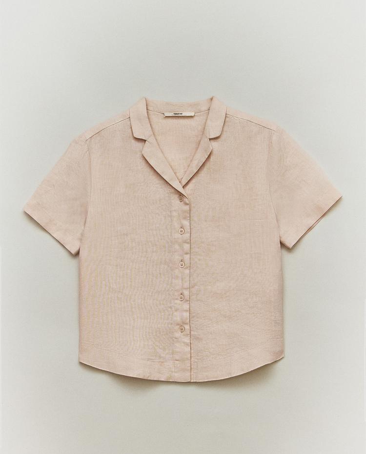 Camisa de lli de siluetes rectes i lleugerament fluides, amb coll clàssic i botonadura frontal.