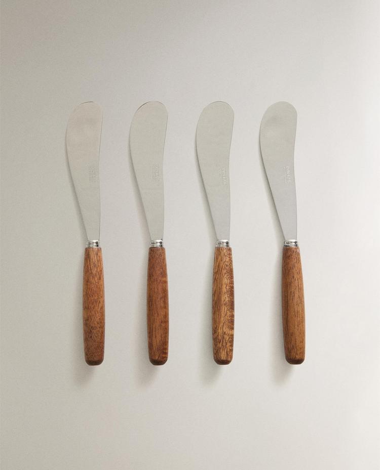 Forquilles de brunch o postres fabricades en acer inoxidable amb acabat polit i mànec de fusta d’acàcia. Presenten un capçal de quatre pues estilitzades i mànecs allargats amb veta visible i superfície llisa.