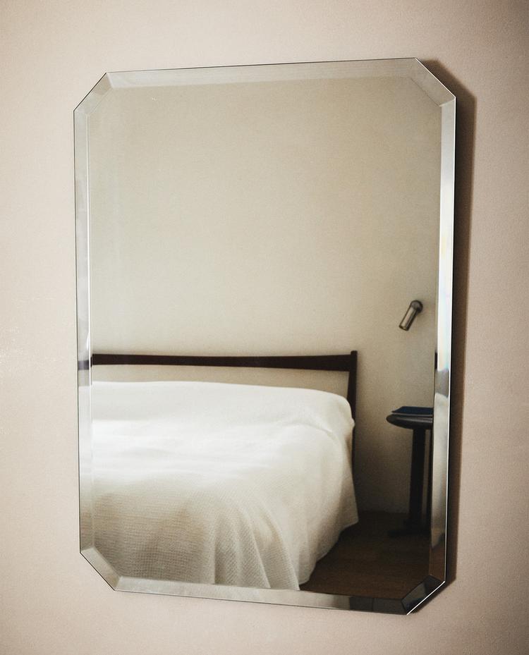 Efecte brillant de paret de vidre amb format rectangular i cantonades aixamfranades. Presenta un cantell bisellat que emmarca el perímetre. Incorpora ancoratges posteriors per a la seva instal·lació a la paret.