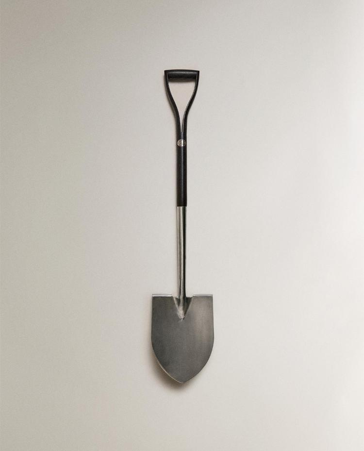 Pala de jardí feta d’acer amb mànec de fusta de freixe. La fulla és ampla i acabada en punta, amb vores lleugerament corbades. El mànec és llarg i recte, rematat amb empunyadura en forma de D.