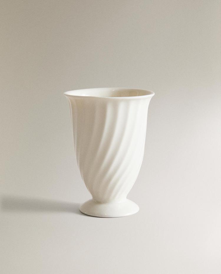 Dosificador de jabón para baño fabricado en cerámica bone china en color blanco, con relieve vertical en el cuerpo, forma suavemente cónica, base integrada y bomba superior de color metálico con acabado satinado.