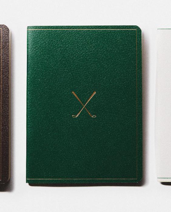 Pack de tres libretas tamaño A3 con tapa blanda y diseño liso con ilustraciones inspiradas en el golf. Cada libreta tiene un color y una ilustración diferente en la portada, con motivos de hoyo, bola y palos de golf.