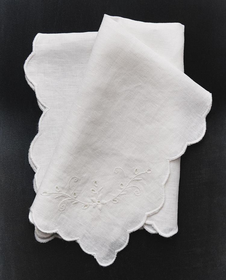 Servilletas confeccionadas en lino con bordados florales a tono y rematadas en ondas.