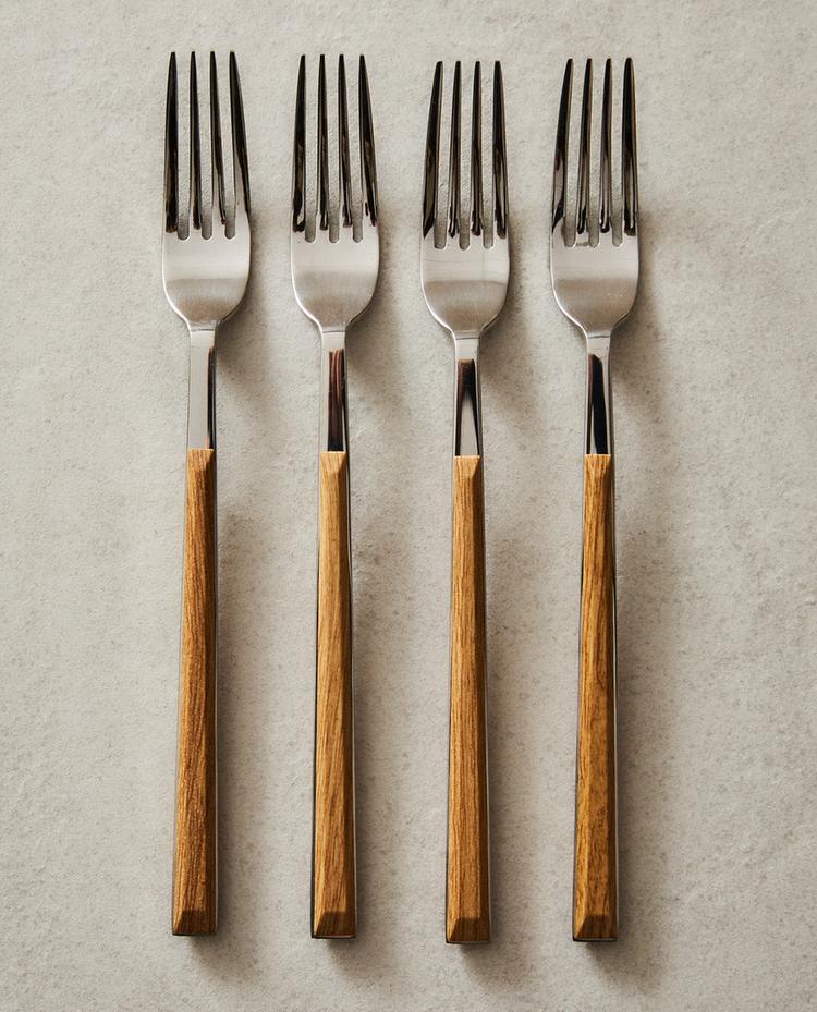 Pack de 4 tenedores de mesa hechos en acero inoxidable 13/0. Mango de diseño fino y efecto madera.