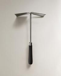 Rastrillo de mano de jardín elaborado en acero con mango de madera de haya. Tiene un cabezal compacto que combina una pequeña pala plana y tres púas largas, rectas y puntiagudas.