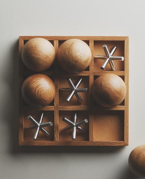 Joc de 3 en ratlla amb peces de metall i roure, sobre tauler de fusta.