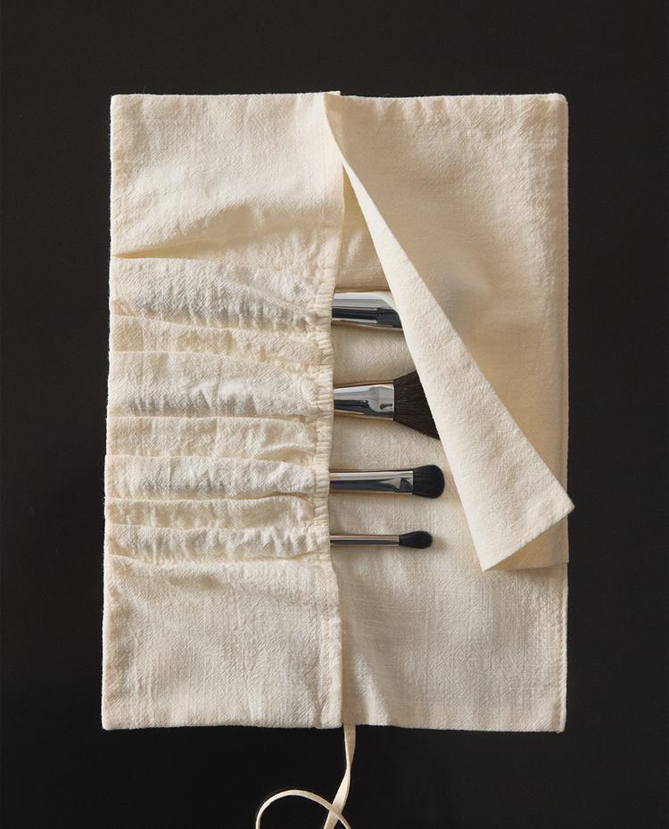 Necesser per a pinzells de maquillatge elaborat en cotó amb disseny enrotllable i tancament amb cordó.