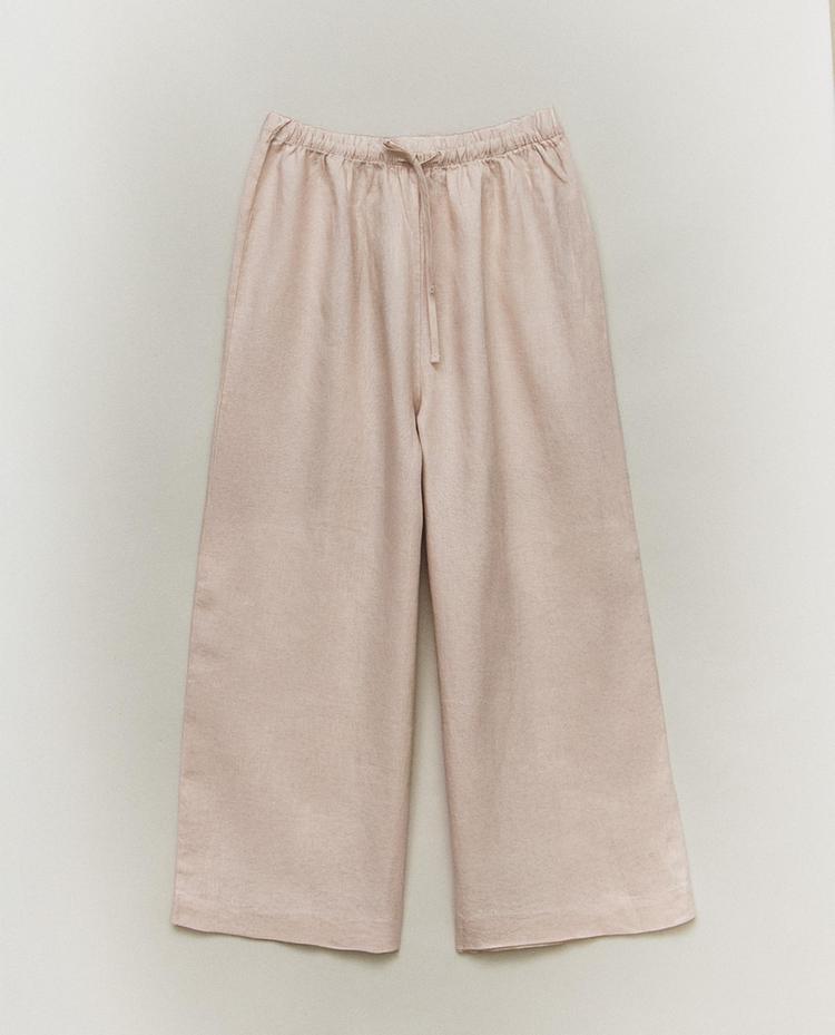 Pantalons de lli de tall ample. Incorporen cintura elàstica per a un ajust adaptable i caiguda recta que aporta moviment.