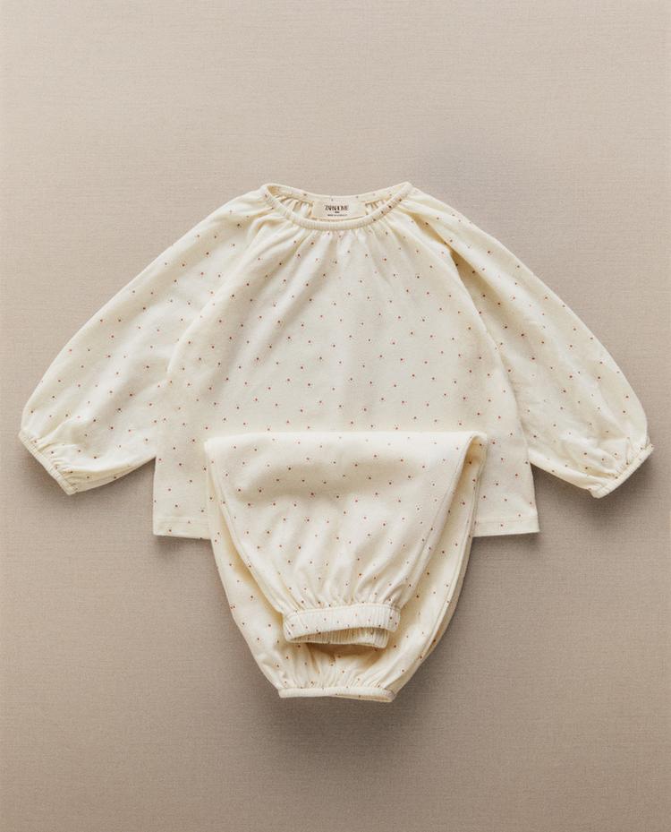 Conjunt de pijama per a nadó confeccionat amb cotó de punt jersei. Format per pantalons llargs amb cintura i baix elàstic i samarreta de màniga llarga amb coll rodó i elàstic a les mànigues.