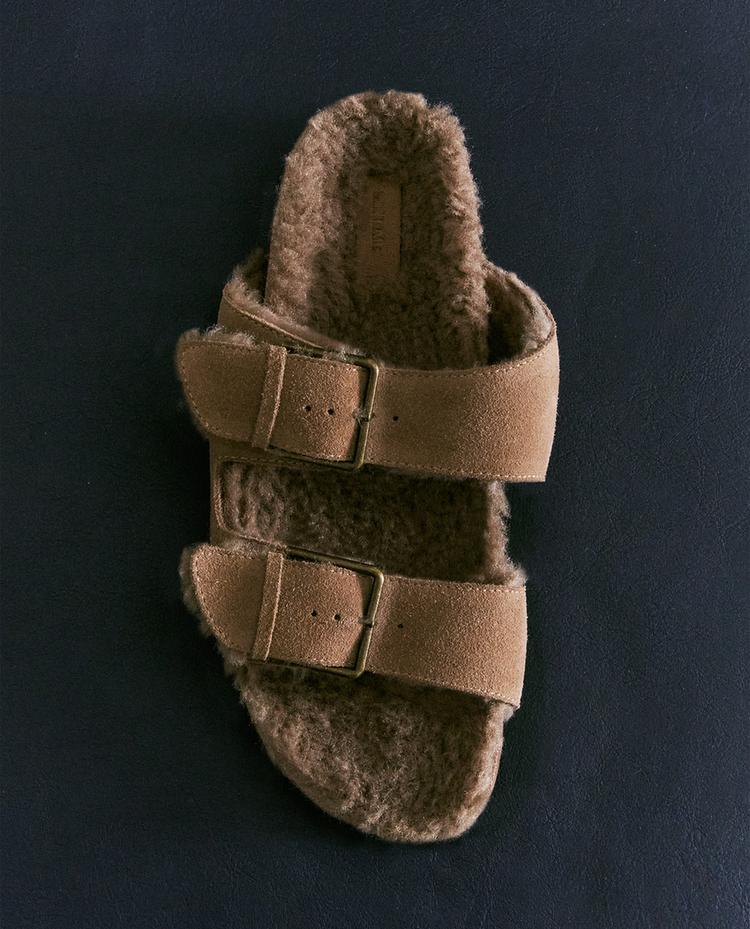 Sabata plana tipus sandàlia de pell amb acabat de serratge. Doble tira davantera amb detall de sivelles metàl·liques. Interior folrat amb efecte pèl.