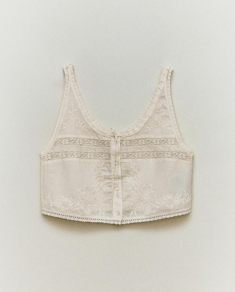 Top confeccionat amb cotó amb tirants amples, escot rodó i detall de puntes a la peça.