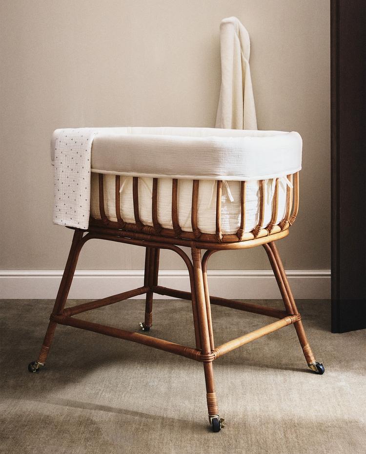 سرير صغير سهل التجميع من الخيزران الهندي بعجلات. غلاف مبطن من الموسلين. لا يشمل مرتبة.