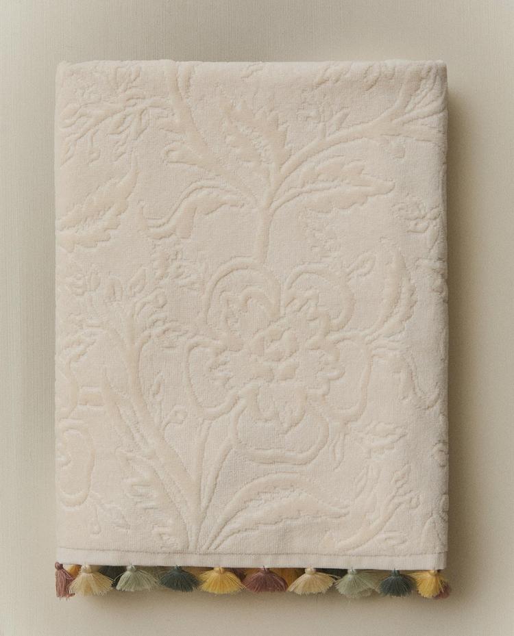 منشفة حمام قطن مخملي بتصميم أزهار جاكار وشرابات متعددة الألوان على الحواف.