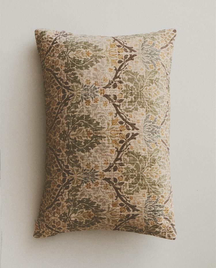غلاف وسادة مصنوع من مزيج من القطن والكتان مع طبعة نباتية من أغصان وأوراق بألوان متباينة.