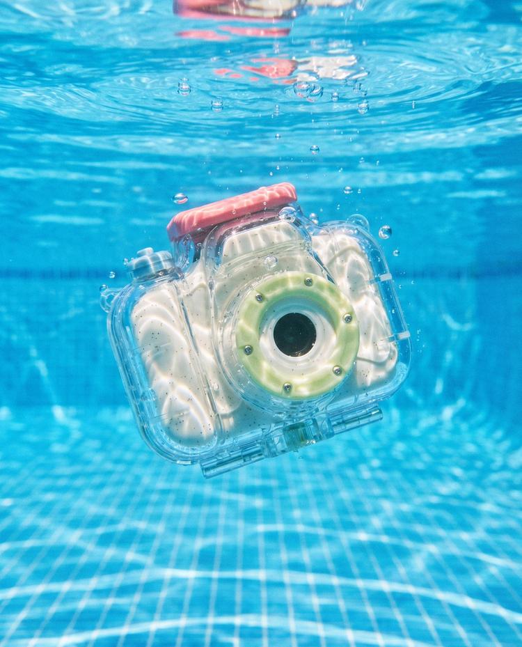 كاميرا للأطفال بعلبة شفافة مقاومة للماء تُغلق بإحكام مزينة بجليتر ومصممة لحماية جهازك من الماء. تُشحن بكابل يو إس بي ومزودة بفتحة لبطاقة الذاكرة.