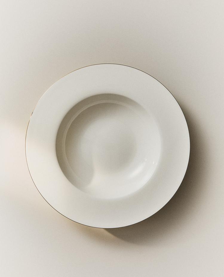 Bone china porcelain soup plate. Decorated with a contrast rim.