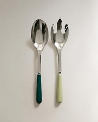 Set sallate inoks me një përfundim të ndritshëm, që përfshin një lugë shërbimi dhe një pirun. Skajet e mëdha me linja të buta dhe doreza qeramikë me ngjyrë.