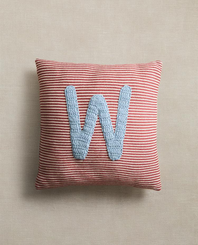 Jastëk pambuku për fëmijë me vija dhe shkronjën "W" të qëndisur në qendër.