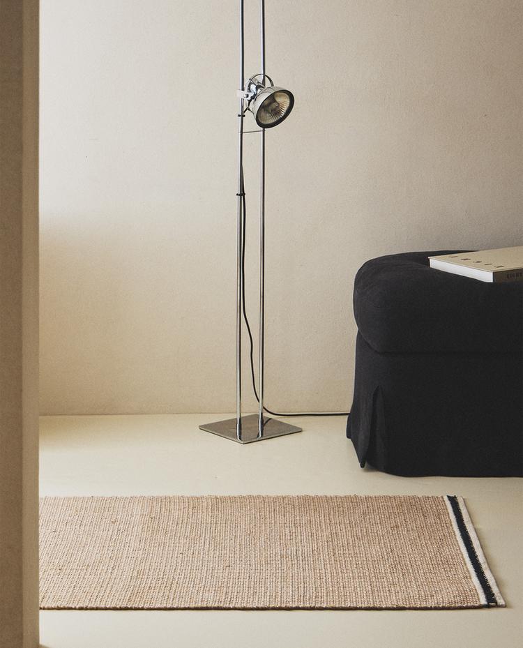 Rrugicë kuzhine prej jute me vija dhe bordurë kontrastuese. E projektuar për të dekoruar dhe mbrojtur dyshemenë e kuzhinës, por gjithashtu e përshtatshme për qoshet e tjera të shtëpisë.