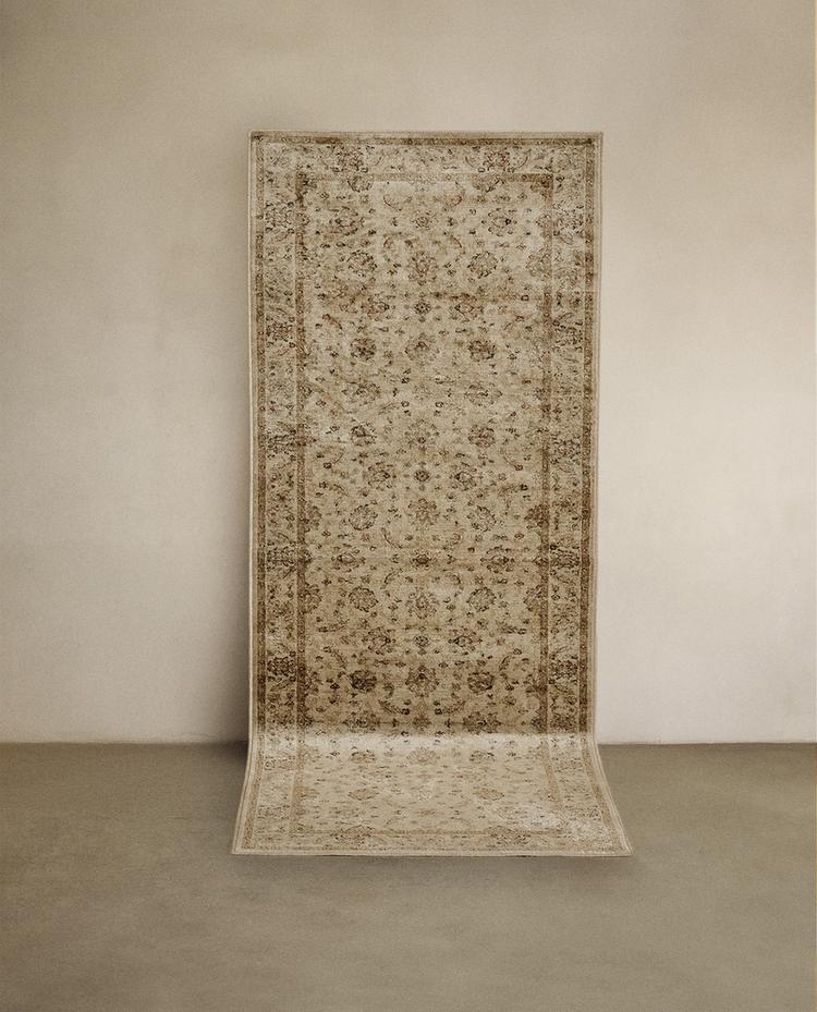 Tapet pambuku dhe viskoze me një dizajn lulesh në tonalitete natyrale dhe bordura dekorative të integruara në dizajn.