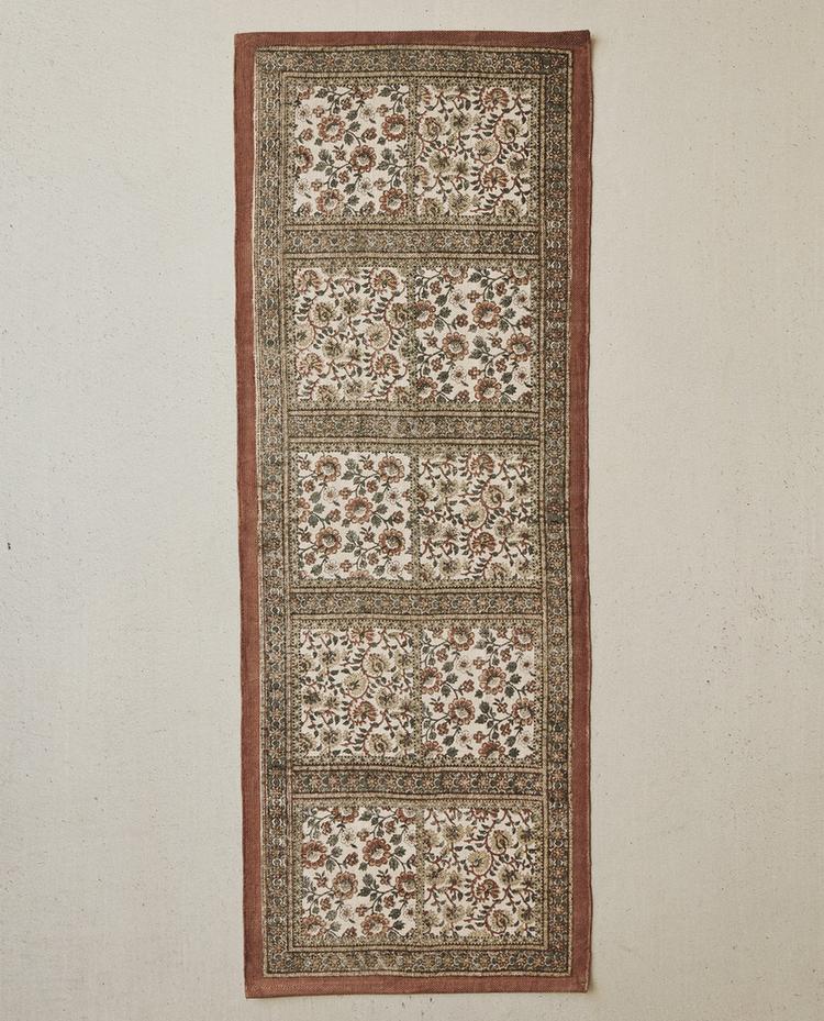 Qilim pambuku drejtkëndor me dizajn bllok në tone të ngrohta dhe korniza kontrastuese.