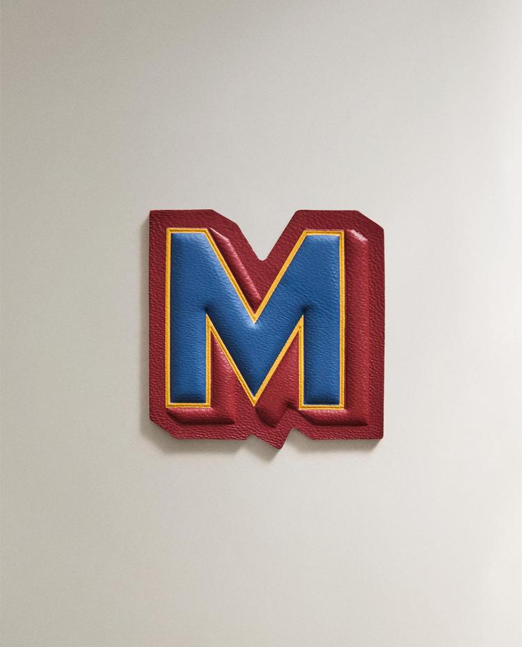 Aufbügelbarer Leder-Patch mit dem Buchstaben „M“ in Kontrastfarben.