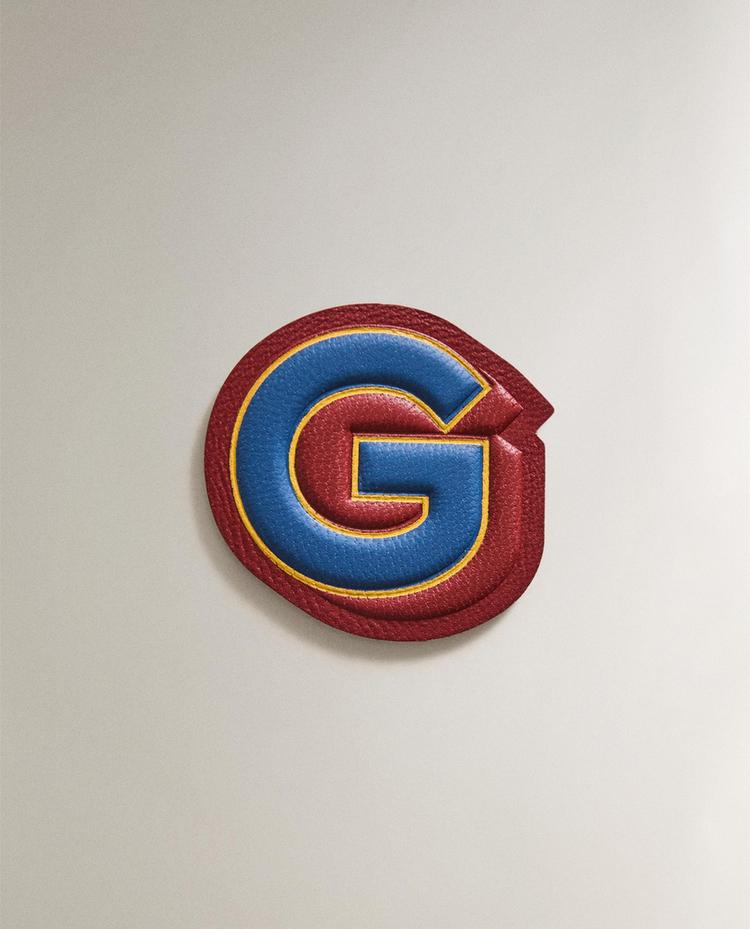 Aufbügelbarer Patch aus Leder mit dem Buchstaben „G“ in Kontrastfarben.