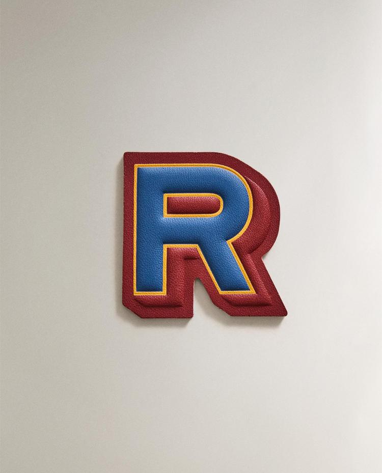 Aufbügel-Patch aus Leder mit dem Buchstaben „R“ in Kontrastfarben.