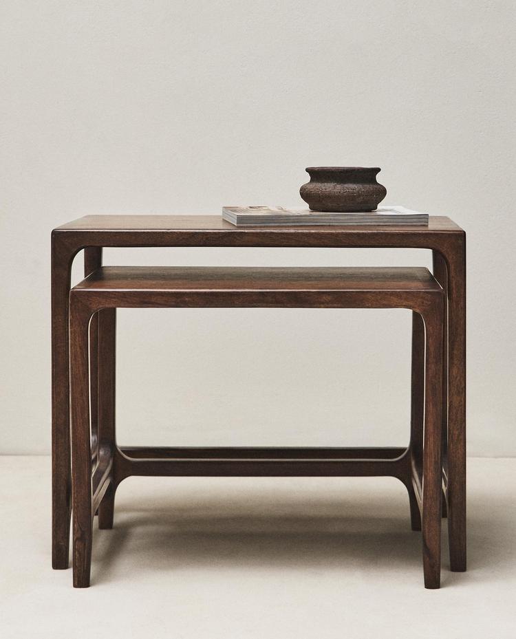 Beistelltische aus Mangoholz, mit abgerundeten Ecken.