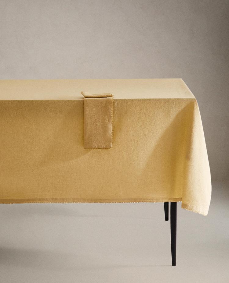 Nappe en coton à motif uni en fil teint et détail en dentelle sur le bord.