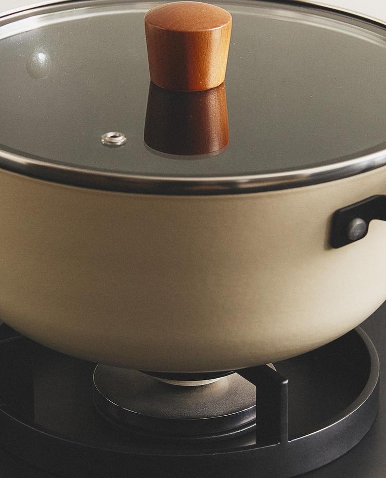 Fait-tout en fer avec couvercle en verre et anses sur les côtés en bois d’acacia. Compatible avec des cuisines à gaz, électriques, induction, vitro et halogène.
