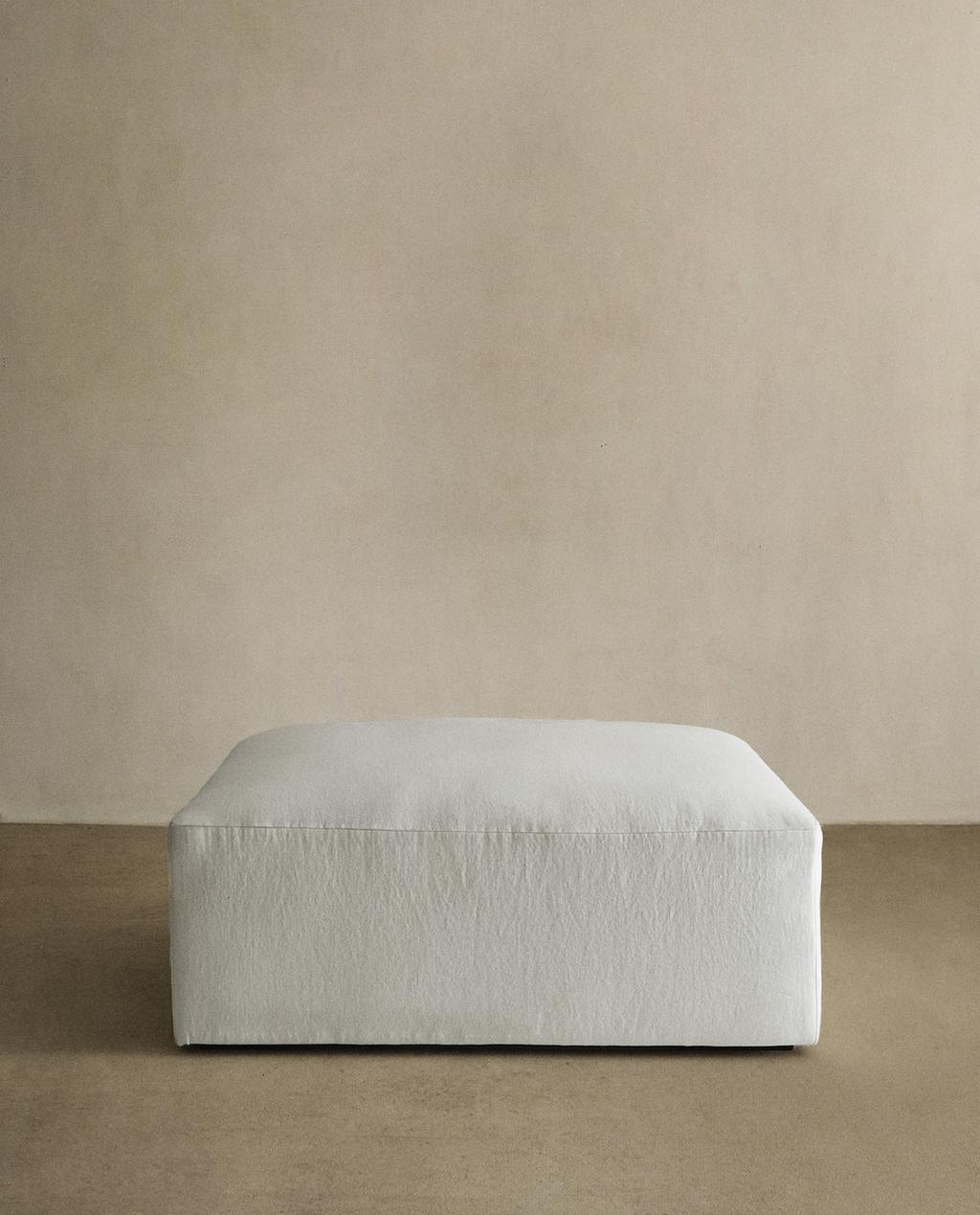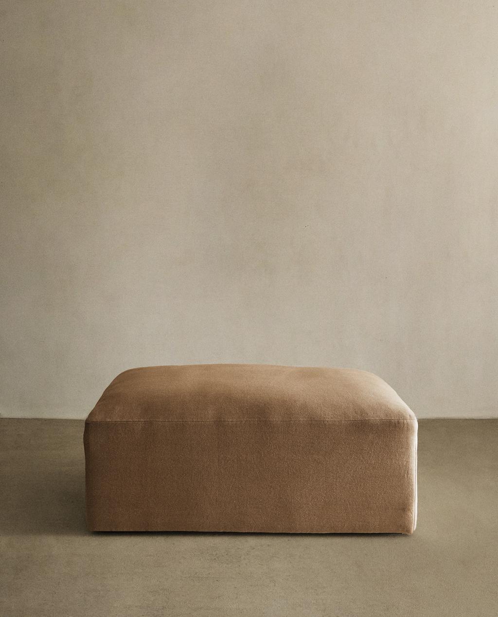 Pouf tapissé de tissu en lin délavé, élaboré avec une structure interne en bois recouverte de mousse et des pieds en bois de hêtre. Son design permet de l'utiliser à côté du canapé de la collection, comme une chaise longue.