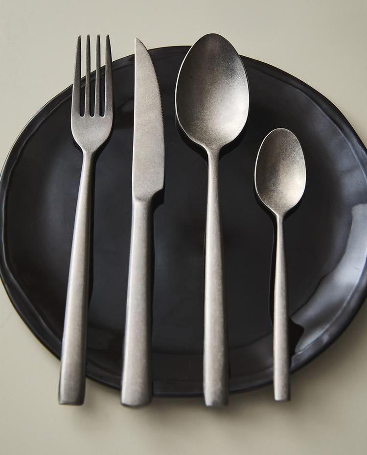 Roestvrij stalen bestek met een vintage afwerking, bestaande uit een vork, mes, soeplepel en dessertlepel.