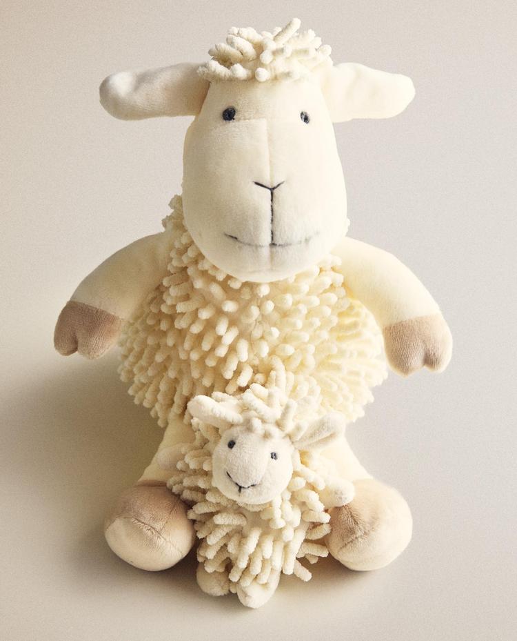 Knuffel voor kinderen in de vorm van een knuffelschaap met geborduurde details, grote oren en zachte applicaties die op schapenwol lijken.