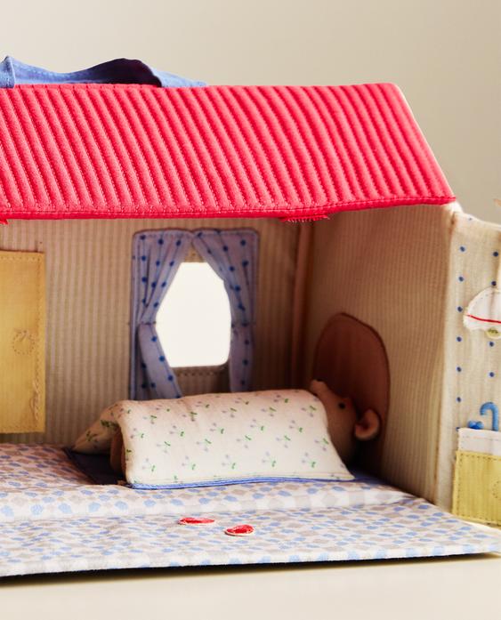 Kinderspeelgoed in de vorm van een huis met een ontwerp dat kan worden gesloten voor makkelijk op te bergen. Inclusief een knuffelmuis.