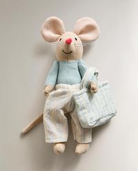 Knuffel voor kinderen in de vorm van een muis met broek en een gestreepte tas.