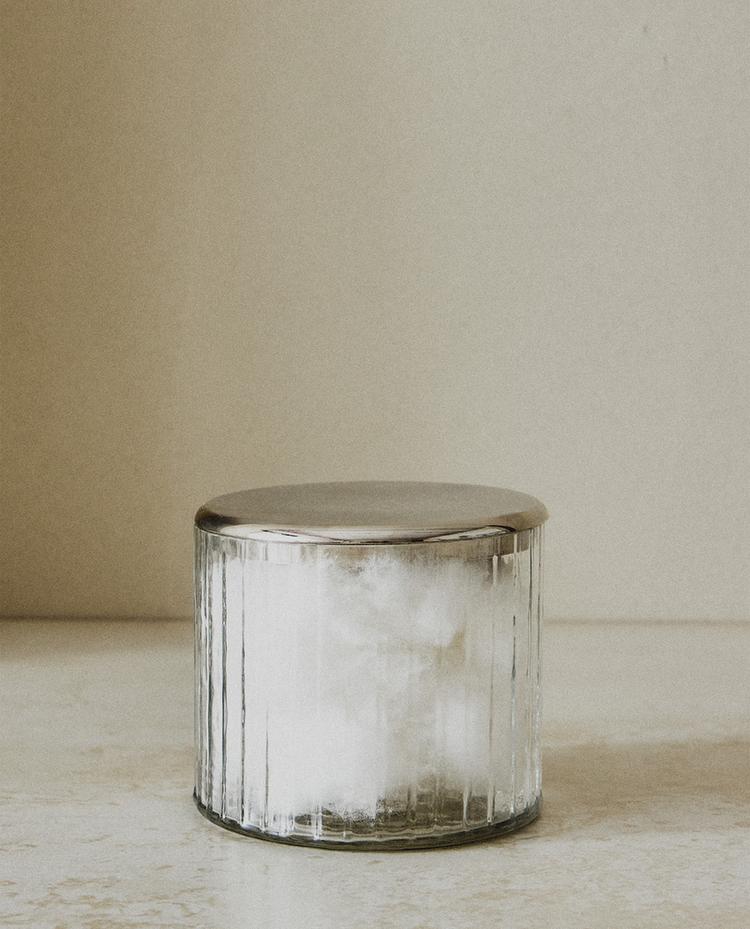 Буркан за баня от прозрачно стъкло с вертикален релеф по цялата повърхност, цилиндричен дизайн с лъскав метален капак и подходящ пръстен по ръба.