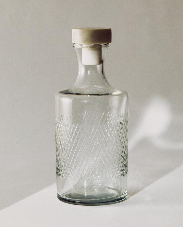 Стъклена бутилка с гравиран дизайн във формата на преплетени ромбове.