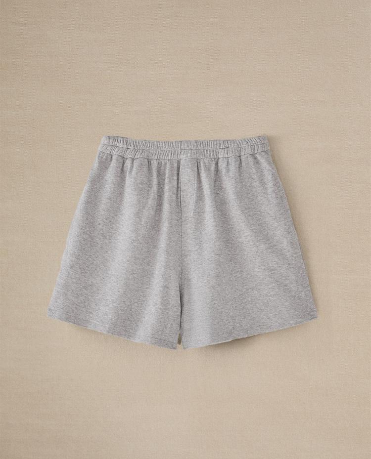 Къси панталони от памук, с изчистен дизайн и обръщащ се ластичен колан. Едната страна на дрехата е светлосива, а другата тъмносива.