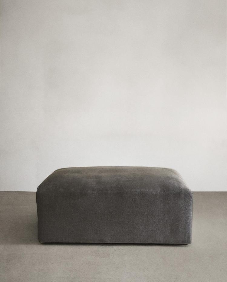 Тапициран пуф от пран лен, изработен с вътрешна дървена конструкция, обвита с дунапрен, и крака от букова дървесина. Дизайнът му позволява да се използва до дивана от колекцията като шезлонг.