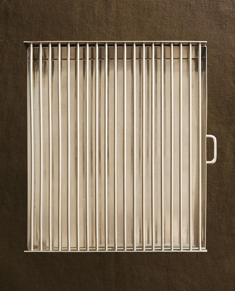 Стоманена поставка за дърва за огрев с подвижно чекмедже, която позволява да се поставят дърва в камината и да се събира пепелта.