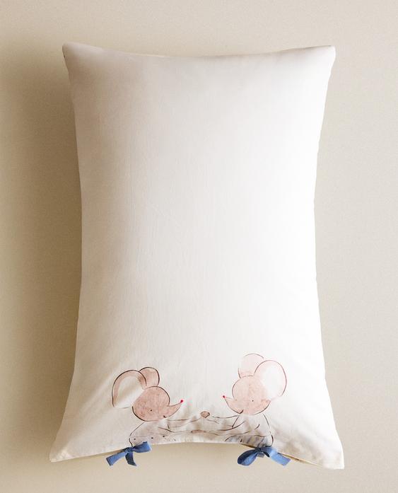 Детска калъфка за възглавница от измит памук с 200 нишки. Дизайн с мотиви на мишлета, сиренца и цветя. Детайл със закопчаване с контрастни връзки при размер 50x75 см.