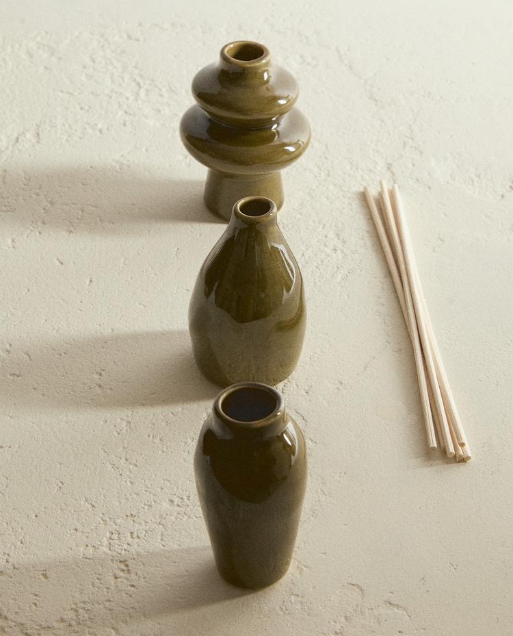 Conjunto difusor de ambiente para aromatizar de maneira uniforme qualquer espaço. Inclui três recipientes com formas diferentes, uns sticks de madeira e uma recarga de 200 ml, para poder encher o dosador.