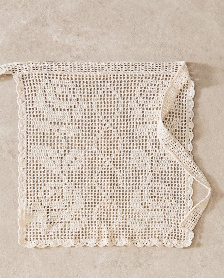 Avental confeccionado em algodão com design de crochê rendilhado.