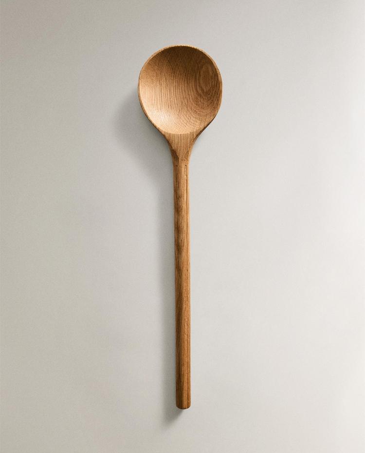 Colher de cozinha em madeira de carvalho com cabeça ligeiramente côncava, projetada para misturar e servir. Sua forma permite um uso cômodo e preciso durante a preparação.