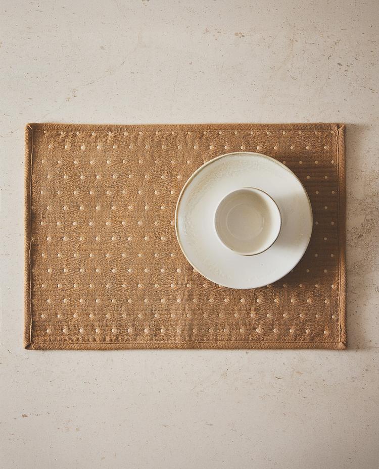 Jogo americano confeccionado em algodão com design acolchoado e detalhe de pontos em contraste.