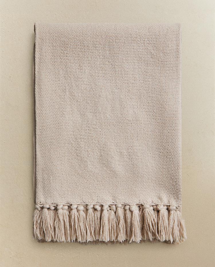 Manta decorativa de cor lisa e rematada em franjas.