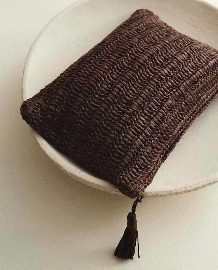 Bolsa de mão estilo clutch de papel trançado. Fecho de zíper com pompom. Complete o seu look com uma bolsa tote bag combinando.