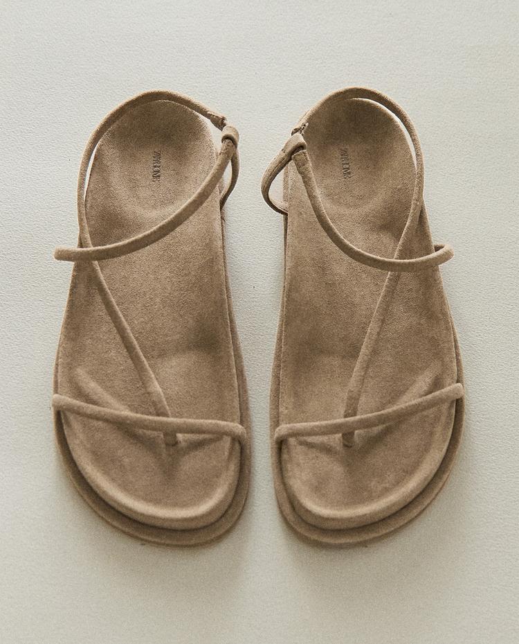 Sapato tipo sandália baixa de couro com tiras finas de posição para o dedo.