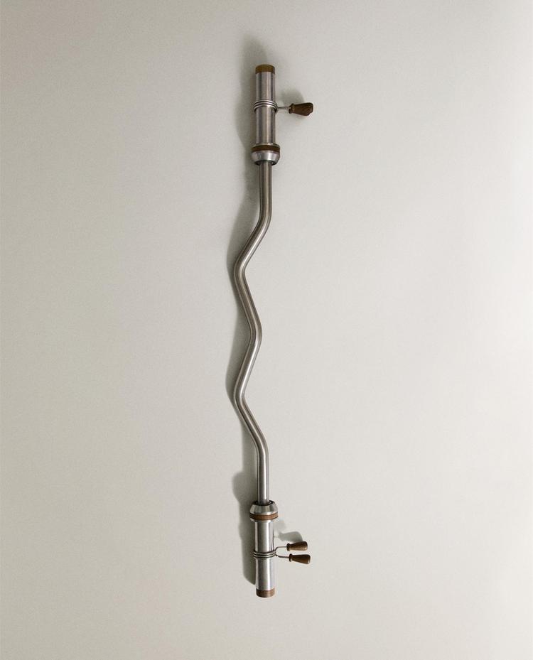 Barra curly ou barra Z para ginásio fabricada em ferro e madeira, com design ondulado característico que permite realizar exercícios de curl de braços de forma mais confortável, ajudando a reduzir a tensão nos pulsos em relação a uma barra reta. Peso: 9,9 kg (21,8 lb).
